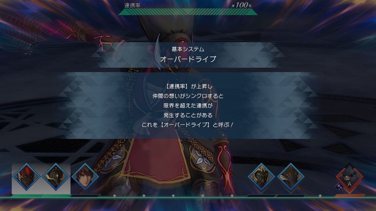 連携率が150%を超えた場合は一定確率(40%)で、200%を超えた場合は確実に、連携をもう一度繰り返します。これをオーバードライブと呼びます。