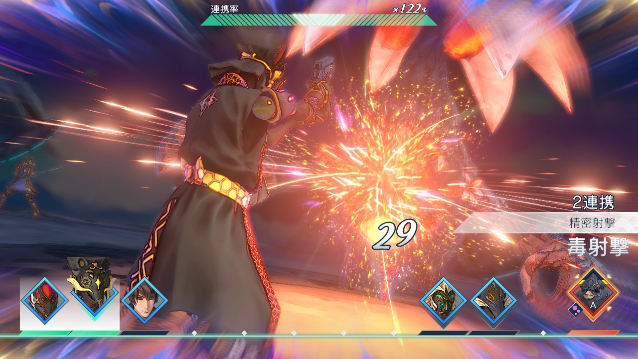 連携内では、「連携率」がカウントされ、この数値が高くなれば高くなるほど、後に続く技・術の威力が増大します。また、単体での攻撃はミスする可能性がありますが、連携すればミスしません。