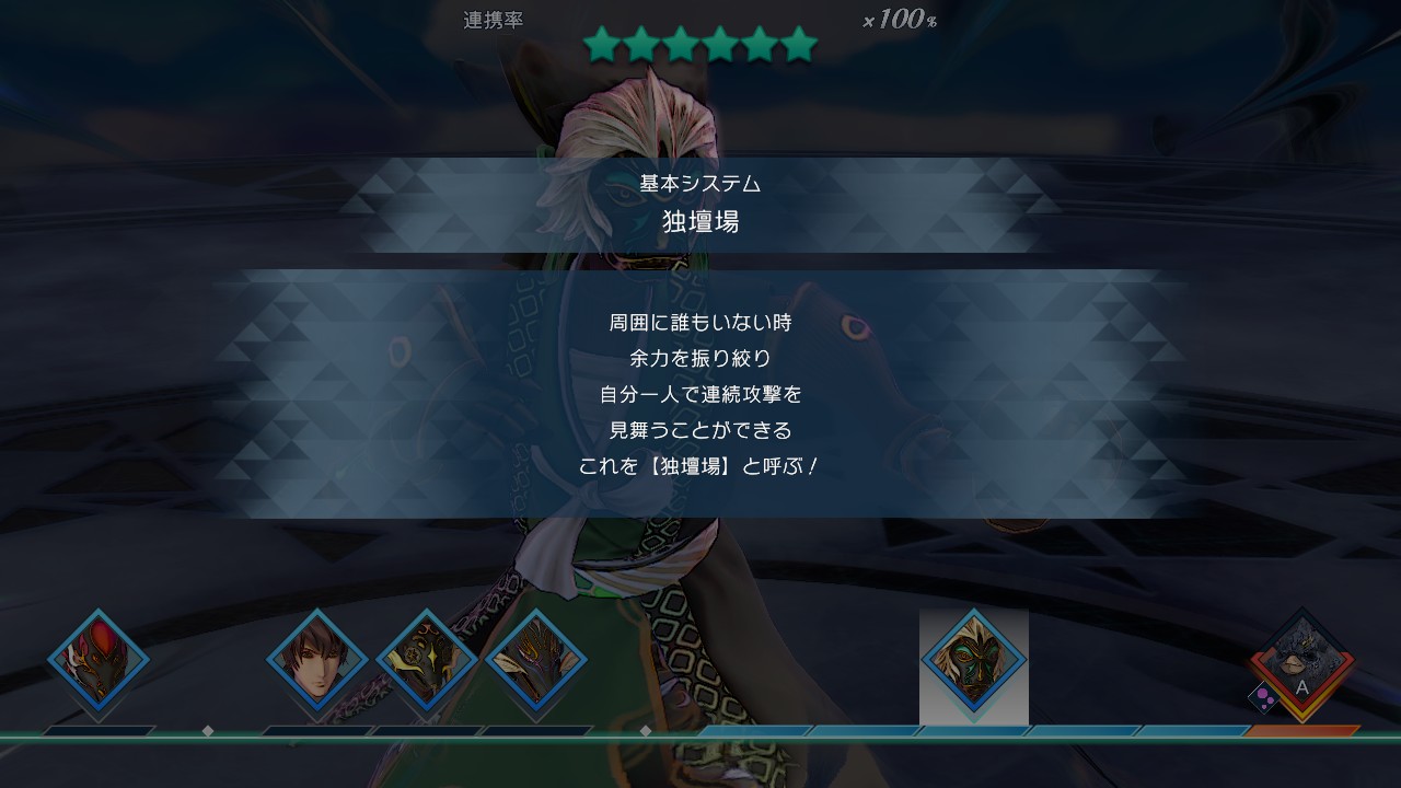 連携の一種ですが、味方同士ではなく、単独で数々の技を敵に叩き込みます。タイムライン上で、自身の左右2マスに誰も居ないとき(端2マス内に居る場合はダメ)に、この「独壇場」が発生します。