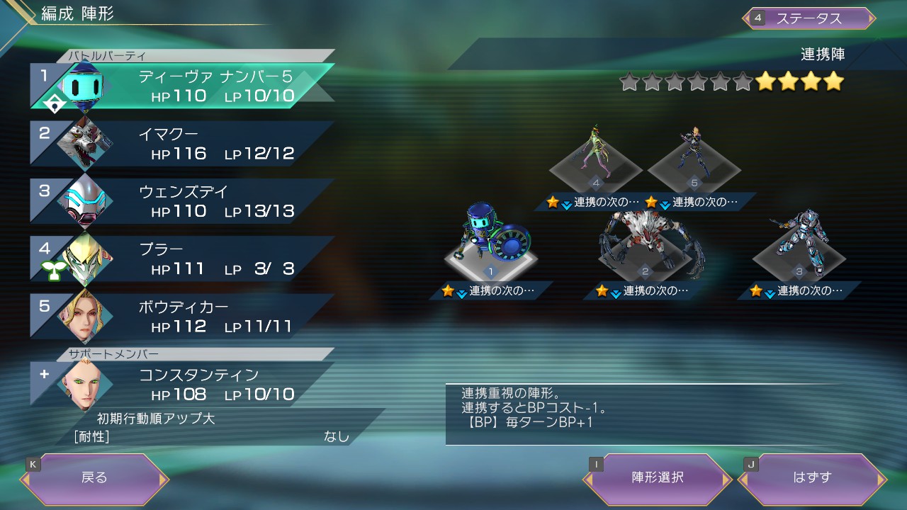 陣形とは、戦闘時のフォーメーションのことですが、実質的には、戦闘時の初期BPと最大BP、およびBPの増減条件を決めます。