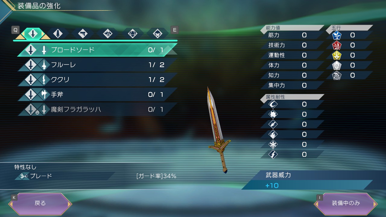 「精霊石」をはじめとする各種「素材」と呼ばれるアイテムは、武器と防具の強化に用います。強化はメニュー画面からいつでも行うことができます。