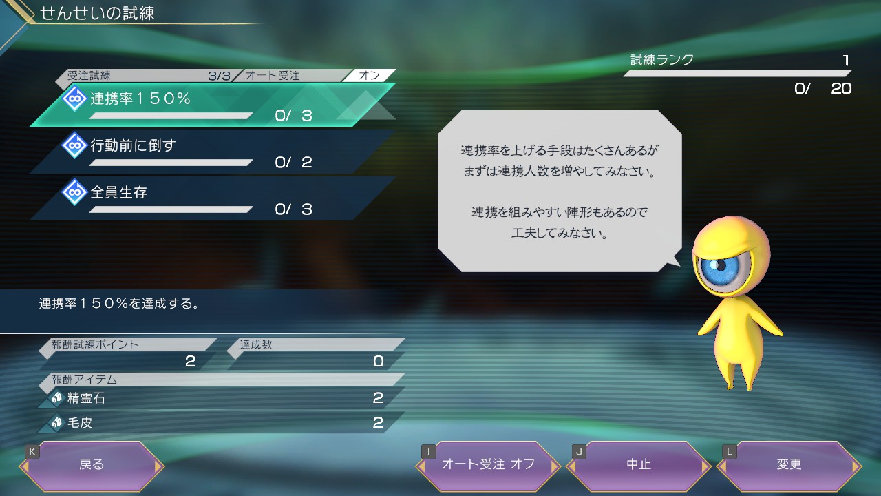 終盤辺りから希少になってくる素材の幾つかは、周回とこの「せんせいの試練」によって効率的に入手できたりもしますので、「トレード」と並んで、今作でゲームを有利に進めるための地道な戦略となります。